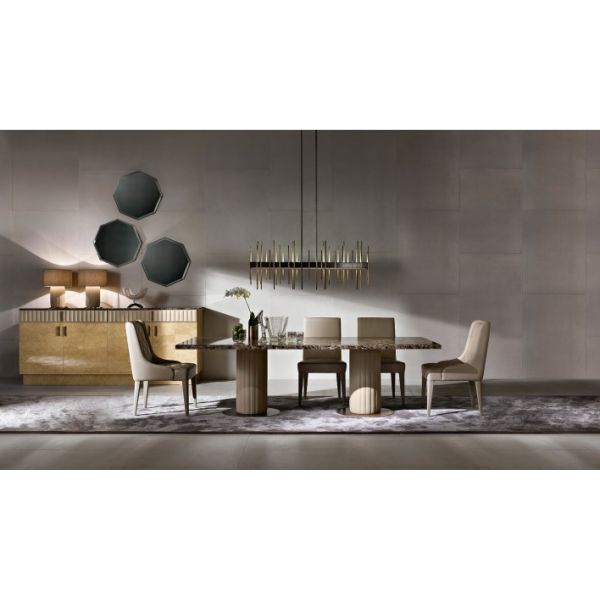 Marble or wooden top. Solid linden, reinforced metal frame with brass base and lumiere leather.