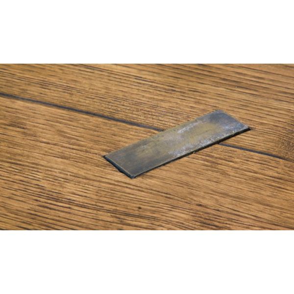 Stained oak table top. Brass details. Dark aged brass base