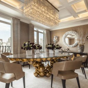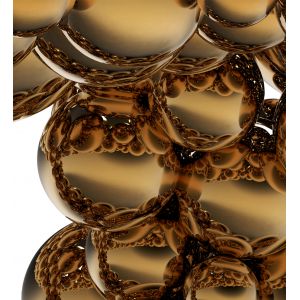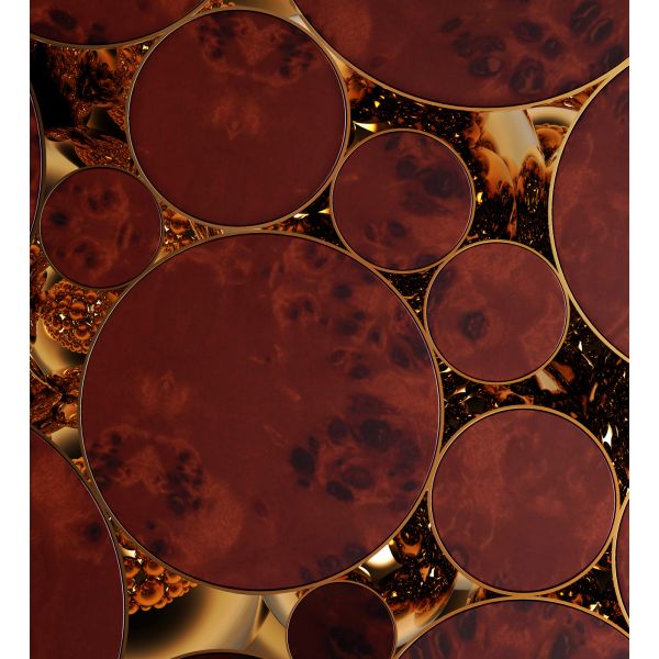 Gold plated brass spheres finished with high gloss varnish on the base and a top made by an amazing myrtle burl veneer, finished with a high gloss varnish