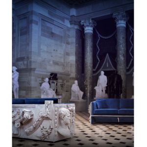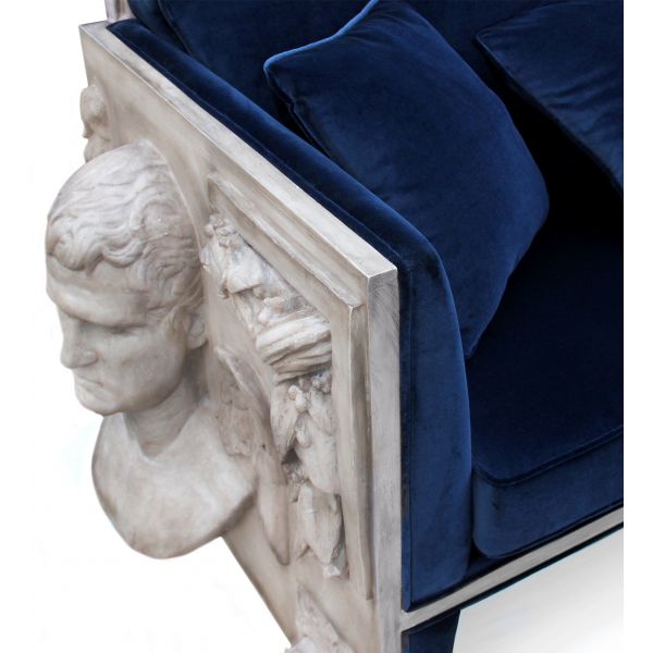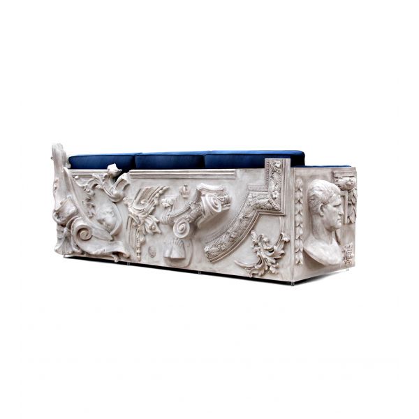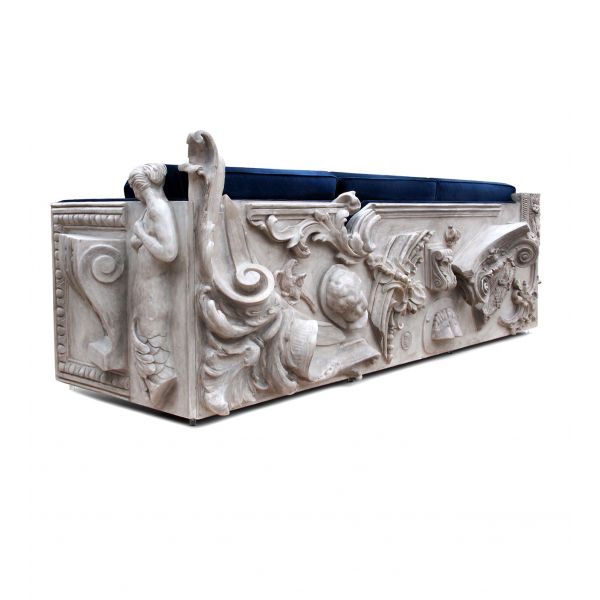 Sofa made in a wood structure and panels in a manual sculpture, produced in resin and finished with restoration techniques similar to stone.