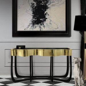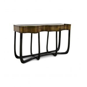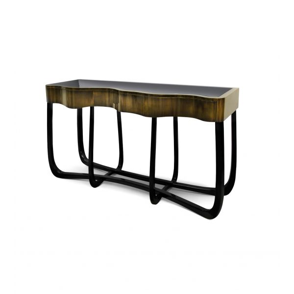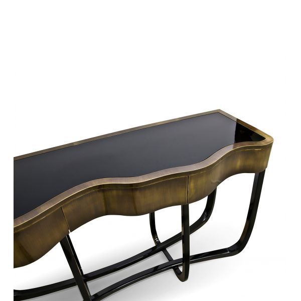 Console with a handcrafted structure made from mahogany with a high gloss black lacquer finish. Contains three drawers finished with polished brass.