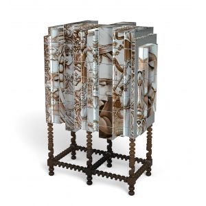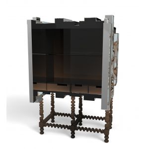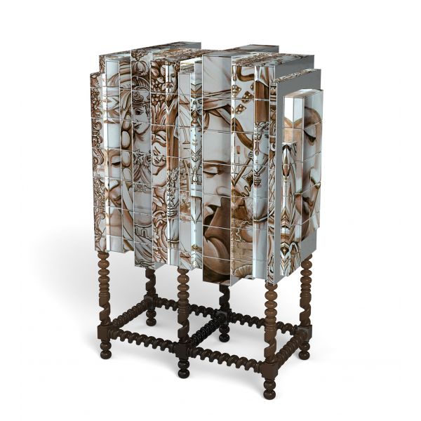 Cabinet made from wood and hand painted tiles with a turned base. Interior is lacquered in glossy black/brown (degrade effect) with high gloss varnish and glass shelf.