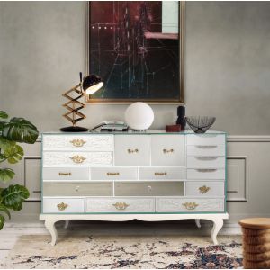 This sideboard bases is made from wood and tempered glass. Composed by 15 drawers and two doors. Its base is made in lacquered wood.
