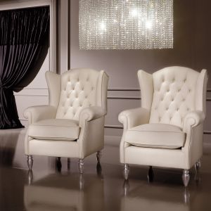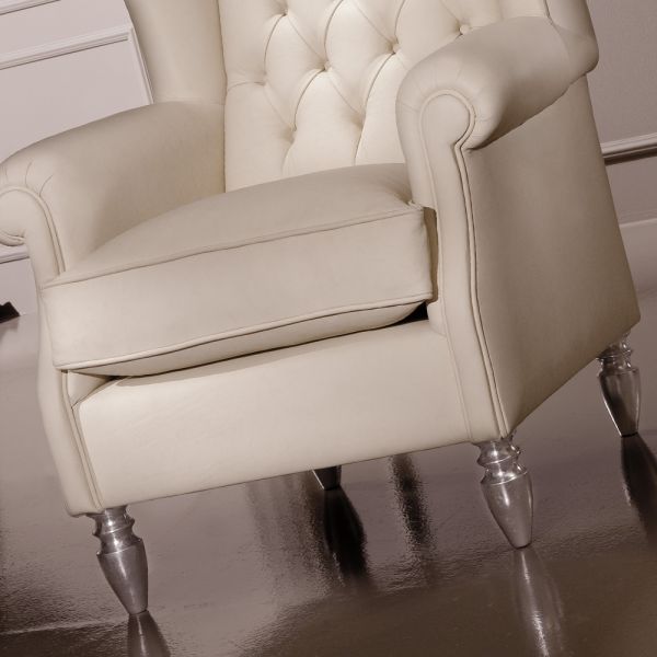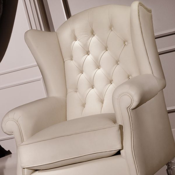 The Designer Italian Leather Wing Style Armchair, recline and succumb to this sumptuous statement armchair. Combining the ultimate in style and comfort indeed. Carved from solid beech wood in a bright silver leaf finish. Superbly padded and button upholst