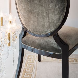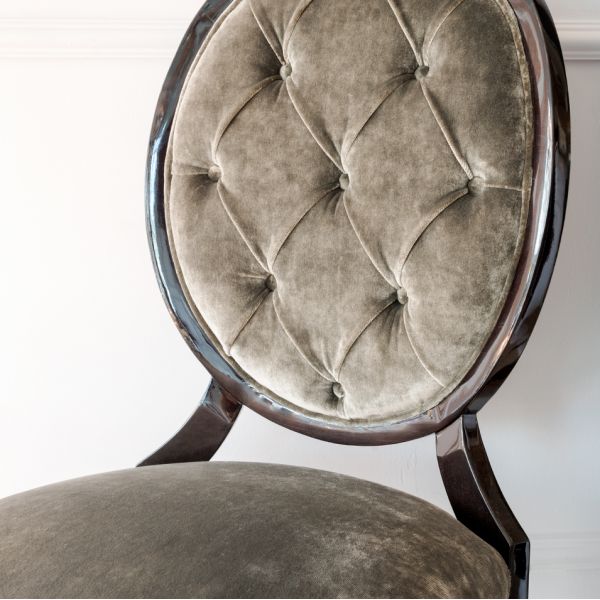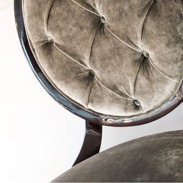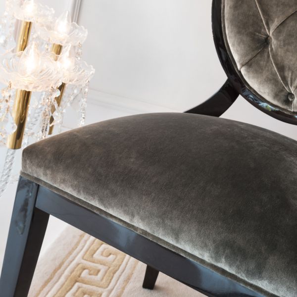 Luxury Grey Velvet Upholstered Dining Chair. This chair combines elegant design elements creating a sophisticated addition to your dining room whilst also providing your dinner guests with supreme comfort. Smooth and buttoned upholstery are padded to the