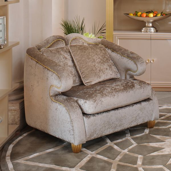 High End Italian Taupe Upholstered Armchair. This seductively sumptuous armchair is made of solid wood and superbly upholstered.?