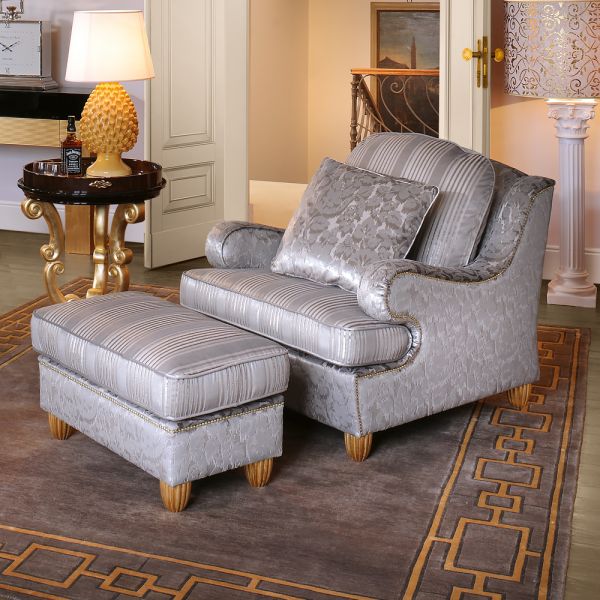 Price for arm chair and footstool.Classic Italian Upholstered Armchair. This classic design is made of solid wood and superbly upholstered to the highest industry standards offering supreme comfort and style. Can be upholstered in a fabric of choice or as