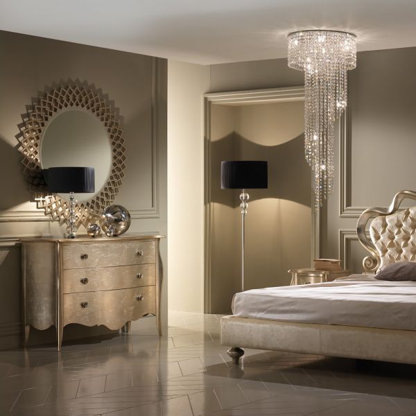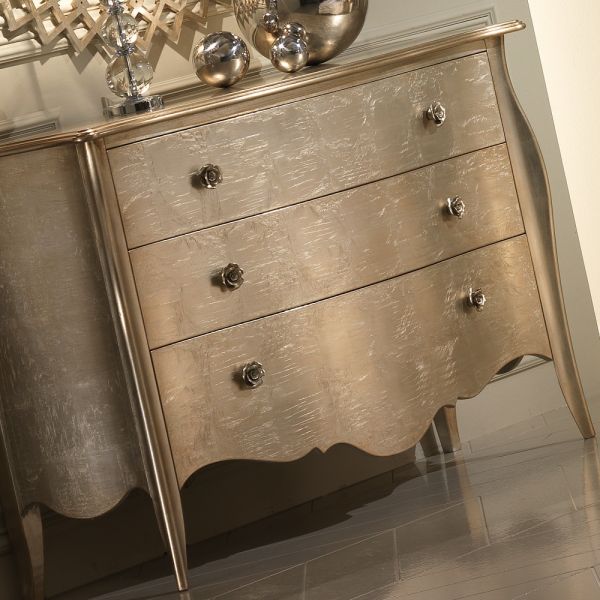 Finished in a glamorous champagne silver leaf and finally completed with striking rose handles in a matching champagne leaf finish creating a sensational piece.