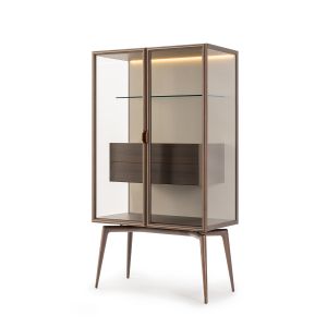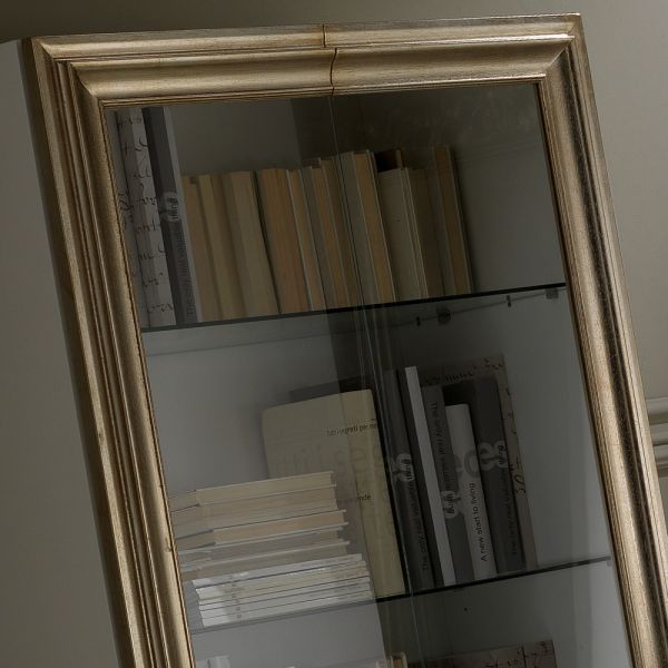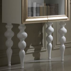 A wooden cabinet in a high gloss lacquered finish with framed glass doors in a champagne leaf finish on solid wood turned statement bubble legs in a matching lacquered finish.