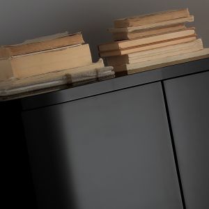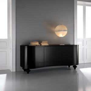 A solid beech wooden structure curvaceous by design, with a matt black lacquered finish to the structure and statement onion wooden turned legs in a contrasting high gloss lacquer.