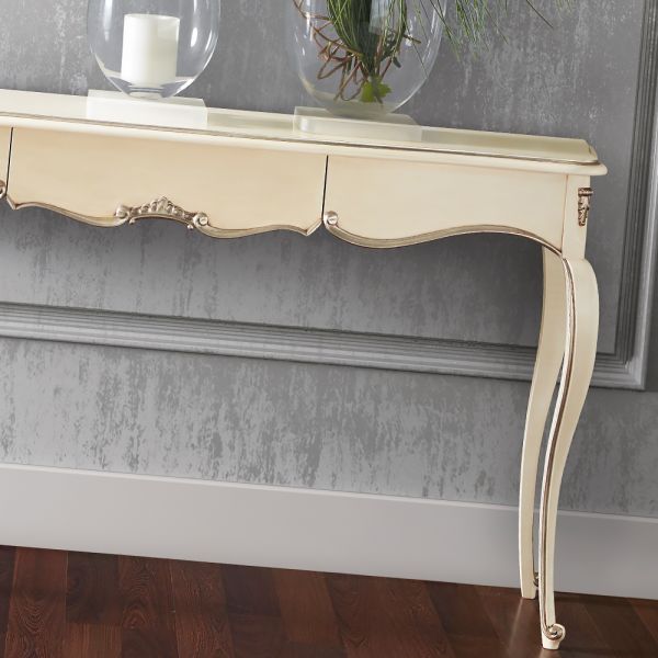 Luxurious Lacquered Cream Silver Console. This is a charming design, well proportioned, elegant and gracious. Made from solid wood and finished with a luxurious old cream lacquer together with hand crafted silver leaf details. Use this affable design in a