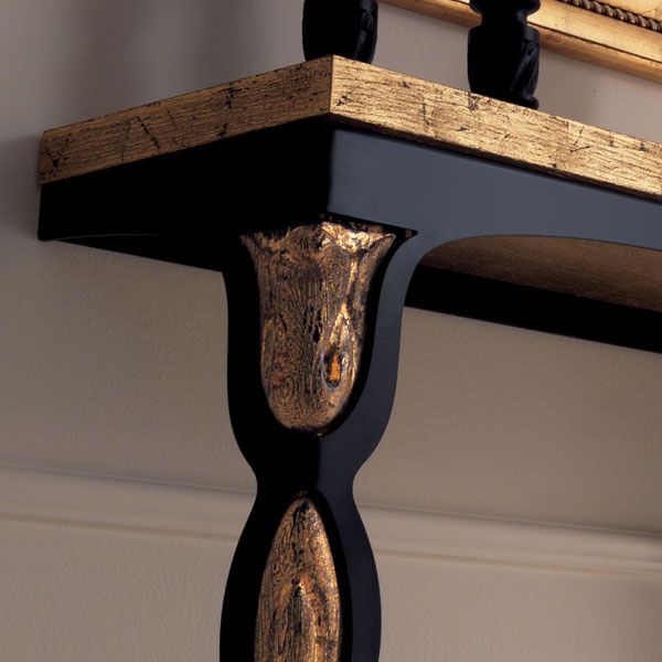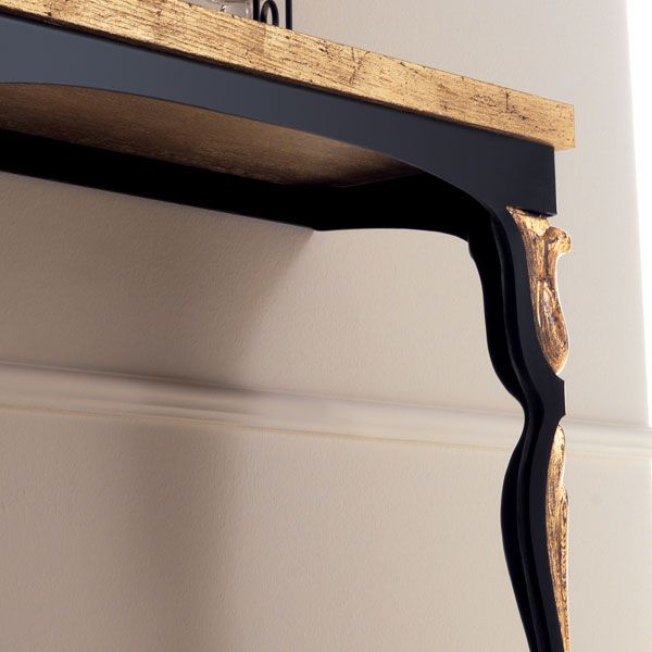 The Italian designer 2 leg wall mounted console table is a striking statement for any room in the house. Shown here as a hallway piece in a glossy black iron frame with sandblasted oak marquinia gold leaf top and legs revealing the unique wood grain finis