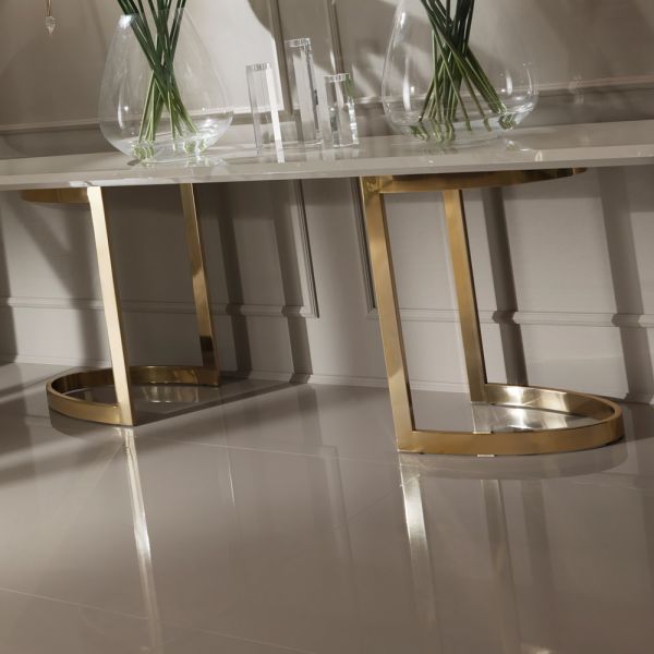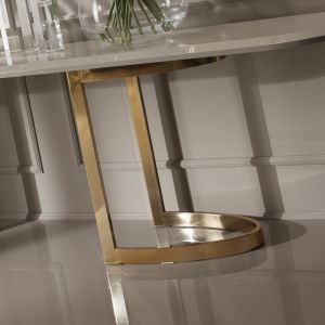 The 24 Carat Gold Oval Designer Console Table, with its unique outline. This superbly stylish console table provides a strong visual effect, daring yet elegant in every way. A wooden bevelled edged top in a high gloss lacquered finish, on a statement oval