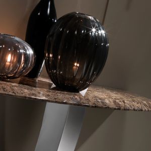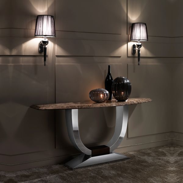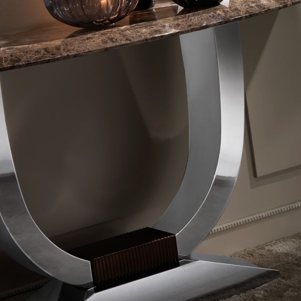 Italian Designer Brown Marble Console. A handsome modern console adaptable to many contemporary interiors. The polished stainless steel curved frame on a plinth style base with feature detailing supports a beautiful variegated 30 mm Emperador dark brown m