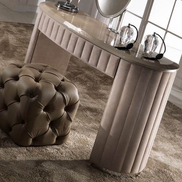 The oval top is in a luxurious taupe RAL lacquered finish. All nestled on polished steel plinth bases.