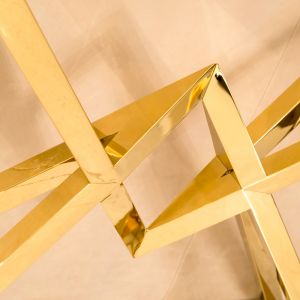 Contemporary Gold Glass Console Table. This modern geometric console table is striking in its design. Combines a gold finished stainless steel frame together with a bevelled glass top. Providing a perfect contemporary design for any modern interior. Shown