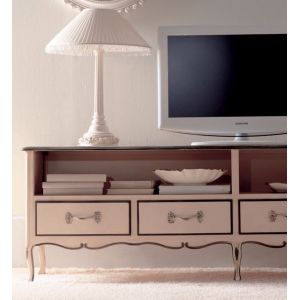 The Reproduction Italian TV unit with drawers with beautiful rose handle detail is shown here in an ivory finish with hand painted black elaborate detailing and a wooden top.