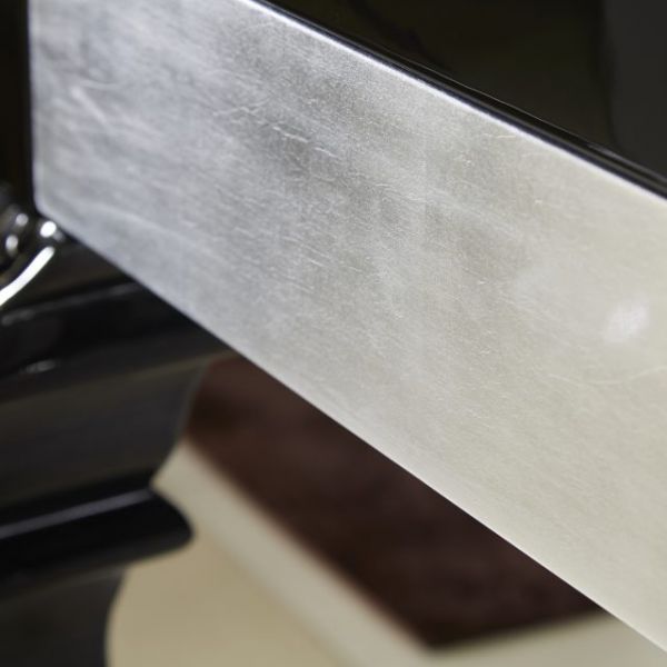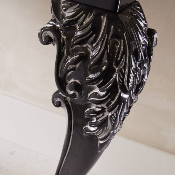 The Modern Baroque Black Console Table is shown here in a black high gloss finish with baroque style legs with silver details. 2 drawers with silver leaf fronts with a push pull mechanism. As comfortable in a dining room, lobby or study as it is as a welc