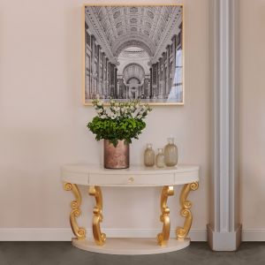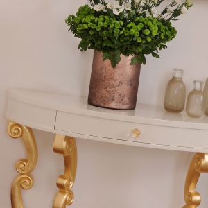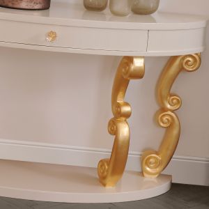 High End Modern Demi Lune Ivory Console Table. The design of this fabulous console table provides a unique focus. Made from solid beech wood and finished in a high gloss lacquer. With gold leaf plinths and a single drawer, together with clear crystal hand