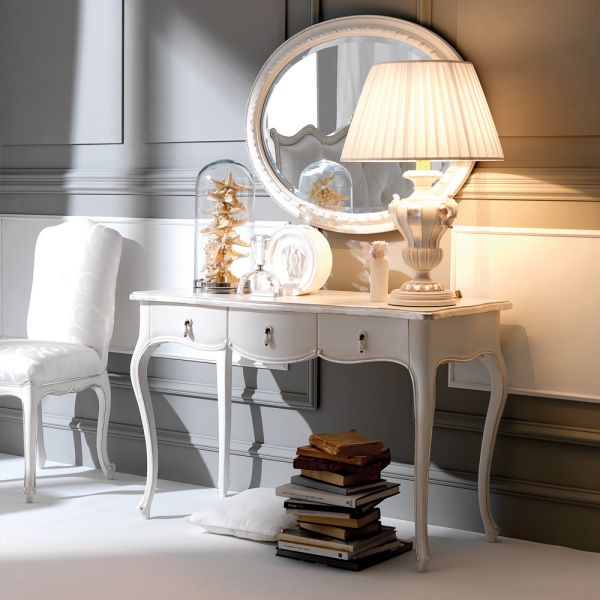 Shown here in an antiqued white finish with accents of silver to the ornate carved frame and beautiful handle fittings with tear drop ceramic pulls.