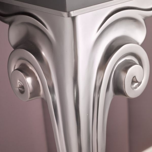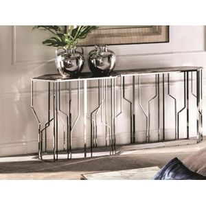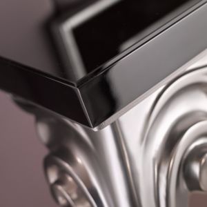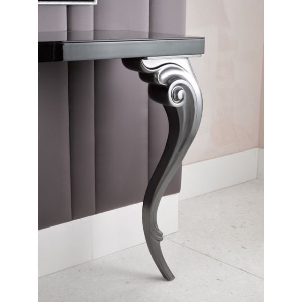 The Elegant Contemporary Black Console shown here has a glossy black finish and a smoked glass top with baroque detailed legs finished in pewter. Width 105 x depth 35 x height 80 cm. Combined with the Elegant Contemporary Nubuck Black Mirror it will give