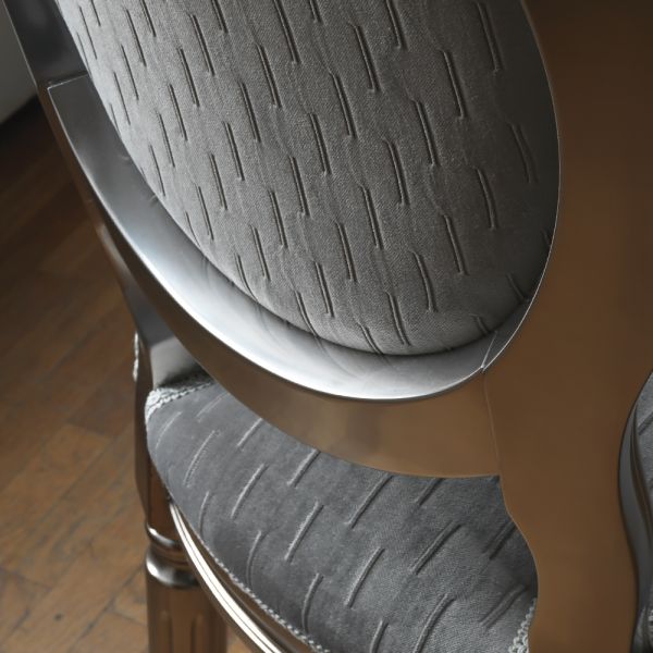 Shown here on trend upholstered with an sensational silver-grey luxury fabric with a unique champagne chrome effect wood finish.