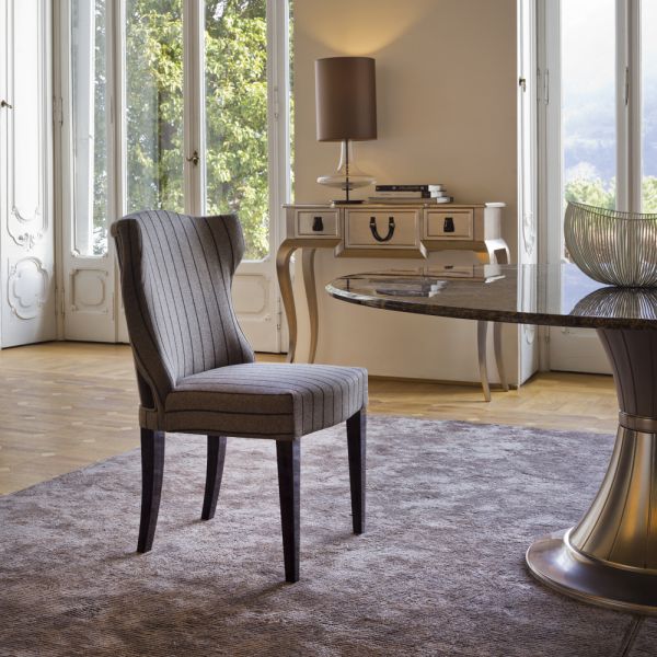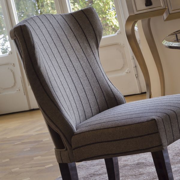 Modern Italian Designer Upholstered Chair. Made in Italy to the highest standards this lovely chair speaks of modern elegance. The solid beechwood winged frame fully upholstered and padded to the highest standards in a luxurious grey and black pinstripe f