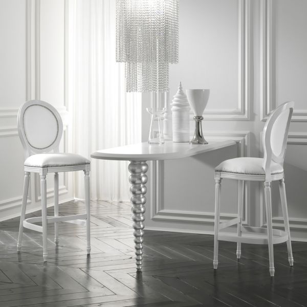 The High End Designer Italian High Gloss Dining Bar, ideal for small spaces still requiring a designer luxurious look. Shown here finished in white gloss with a feature single silver leaf leg.