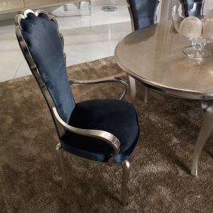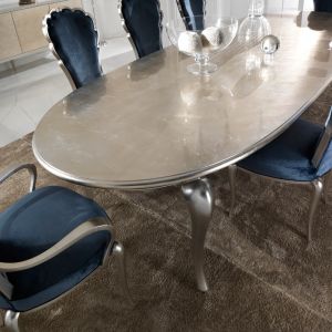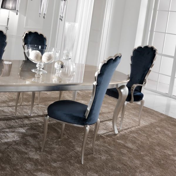 Silver Leaf Dining Set Including Navy Blue Velvet Chairs. An truly enchanting dining table and chairs set creating a luxurious ambience perfect for intimate sophisticated dinner parties. Lit with candlelight this table will add a mesmerising shimmer to yo