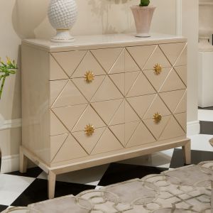 A high gloss cappuccino lacquered structure with 8 feature deco style ribbed drawers, statement metal drop handles in an antiqued gold finish with a perfectly contrasting top insert in the finest polished Emperador dark marble.
