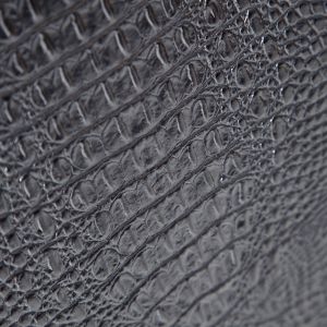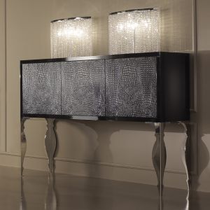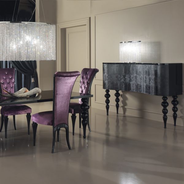 A solid beech wooden structure curvaceous by design, in a high gloss black lacquered finish with the front upholstered in a high quality black alligator pattern embossed leather completed with statement black high gloss lacquer bubble legs.