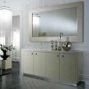 Shown here in a luxurious ivory alligator embossed leather upholstered finish, on a polished steel plinth base together with matching contemporary square handles.