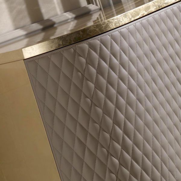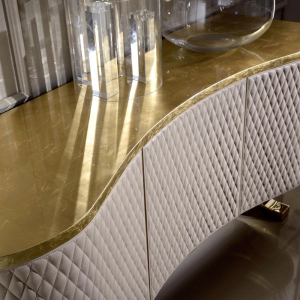 The Designer Italian Quilted Leather Sideboard Buffet, shown here in a gold leaf finish with 3 quilted fine Italian leather cabinet door fronts.