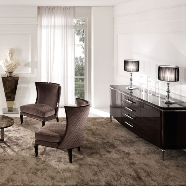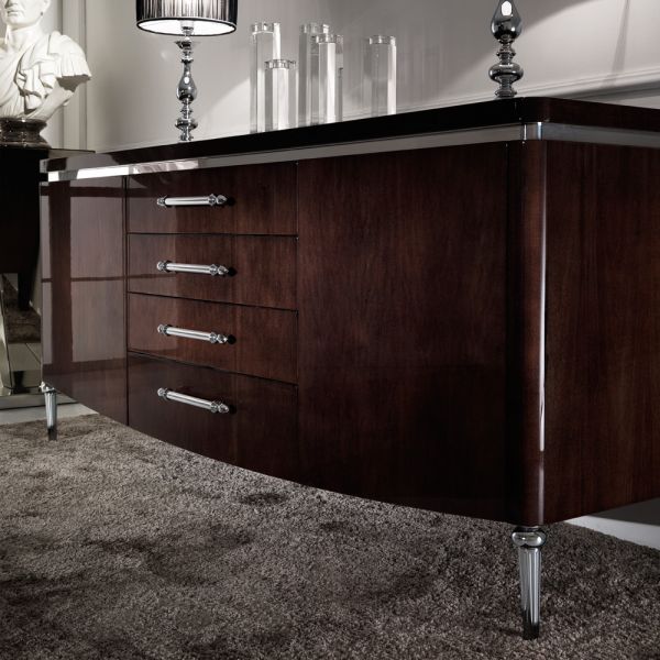 Shown here with a walnut veneer finish with bright chrome handles, legs and design trim.