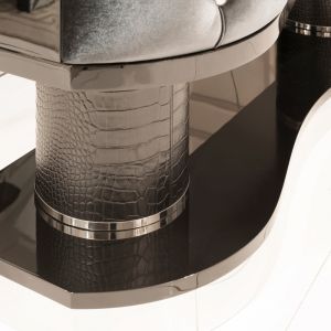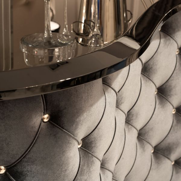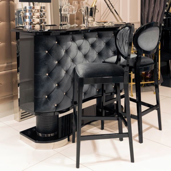 Shown here finished with a high gloss black lacquered top together with a sumptuous black velvet chrome buttoned upholstered front.