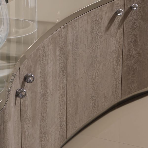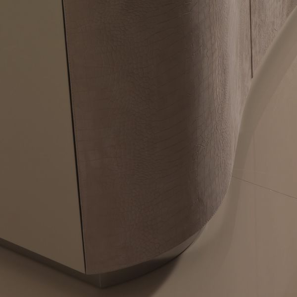 Shown here in a luxurious taupe RAL lacquered finish, together with striking polished stainless steel plinth style base.