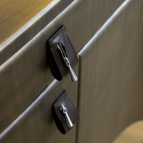 Shown here with a hand brushed brass finish and black leather and chrome zipped toggle handles.