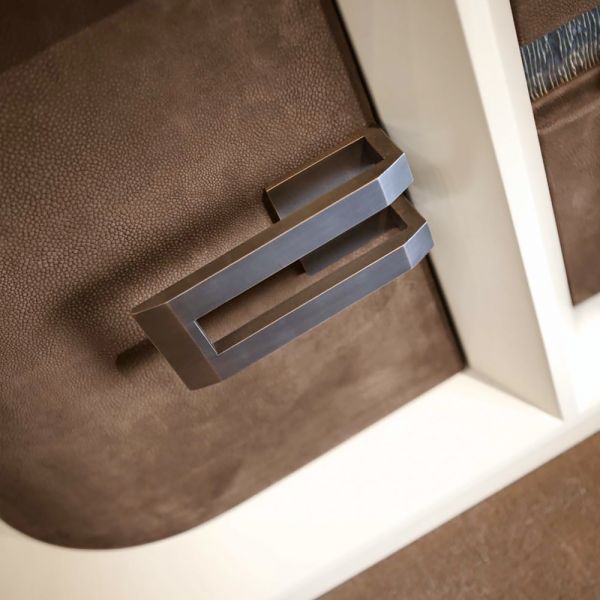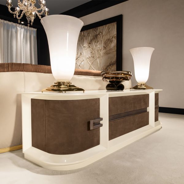 Featuring a champagne lacquered finish together with two beautifully curved doors and two drawers.