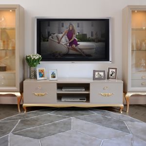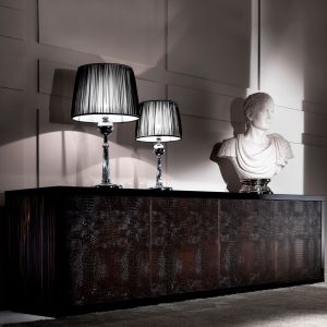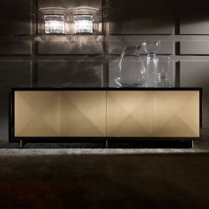 A high gloss cappuccino lacquered low structure with feature deco style ribbed drawers, statement metal drop handles in an antiqued gold finish with a perfectly contrasting top insert in the finest polished Emperador dark marble.
