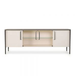 Modern Baroque Mirrored Sideboard is shown here in a white high gloss finish with mirrored and bevelled door fronts.