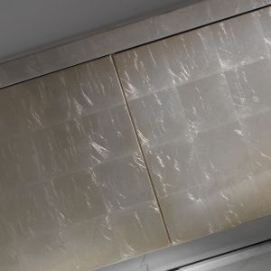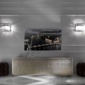 Shown here in the most luxurious shimmering champagne leaf finish on a polished steel plinth base.