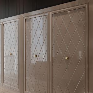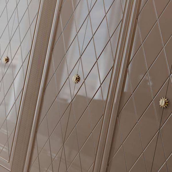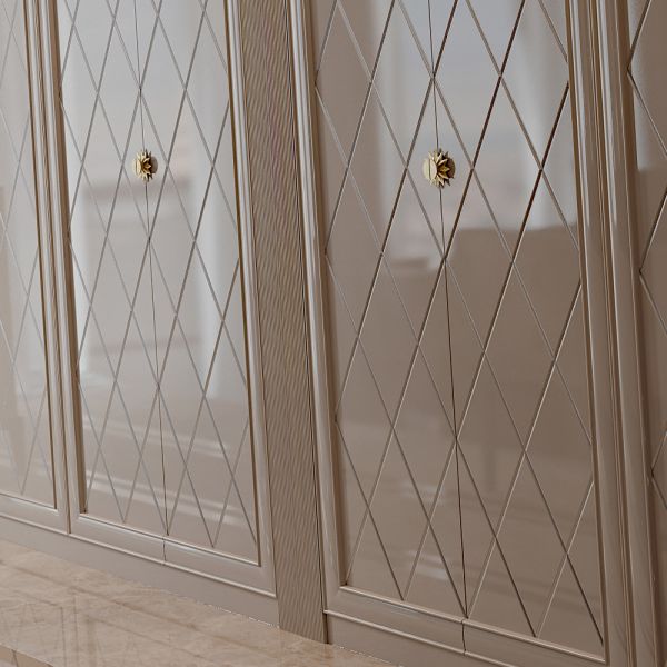 A high gloss cappuccino lacquered framed structure with silver leaf diamond detailed doors, together with statement sunburst feature handles in an antiqued gold finish.