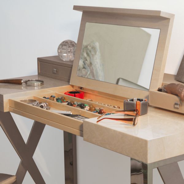 Shown here finished in a high gloss ivory Sycamore wood veneer with polished stainless steel legs.