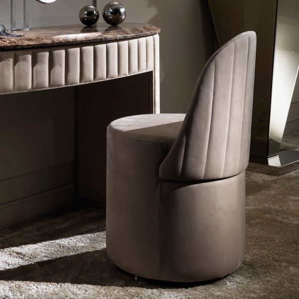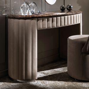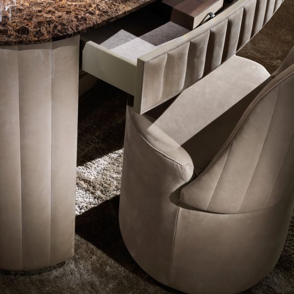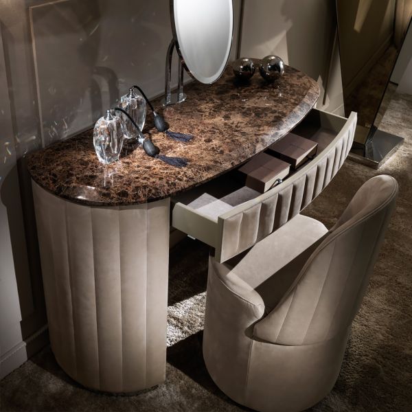 A wooden structure is quilted, panelled and stitch detailed in a high quality nubuck leather, with a striking oval top in a luxurious dark Emperador marble and hidden drawer incorporating an integrated soft close bluemotion system for effortless closing.