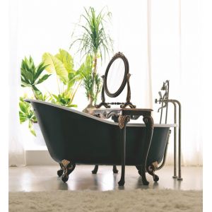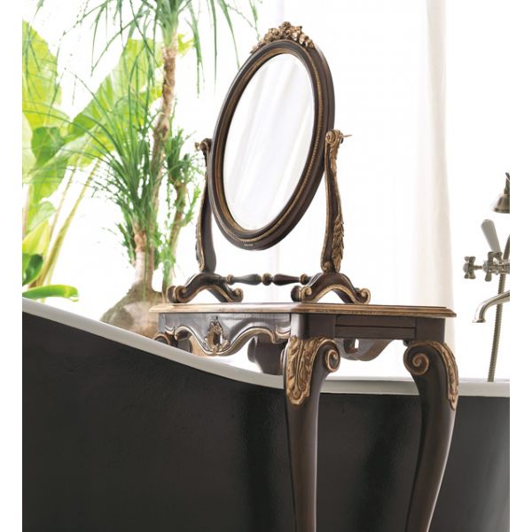 Shown here in a rich black with hand painted gold elaborate detailing and a wooden top.