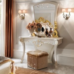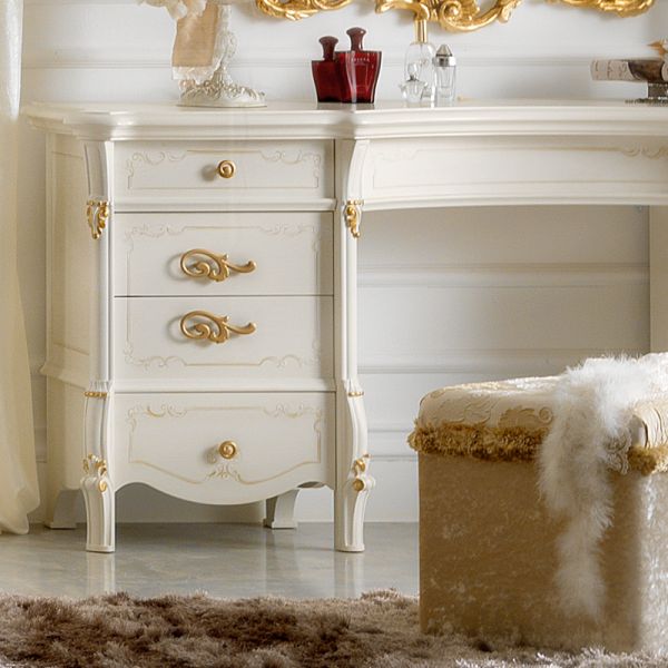 Shown here in a soft ivory painted finish with beautiful bright gold leaf hand painted detailing and accentuated with elaborate handles in a matt gold.