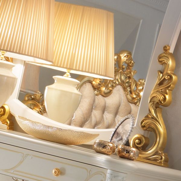 Shown here in a vibrant white painted finish with beautiful bright gold leaf hand painted detail accentuating the carved details.