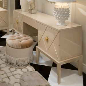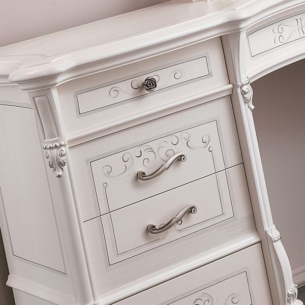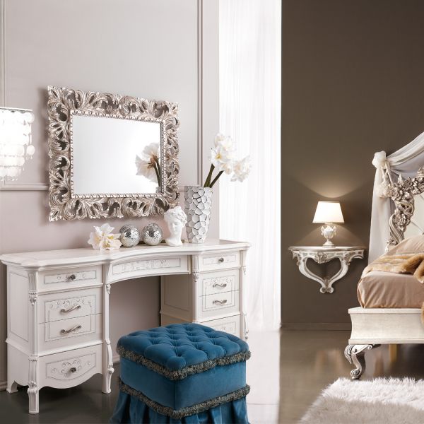 Shown here in a vibrant white painted finish with pretty pattern detail and beautiful bright hand painted silver leaf accentuating the carved elements.