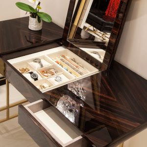 Made from the highly regarded Amara-ebony wood. With hints of warm tones this exquisite dressing table is finished in a classic high gloss to accentuate the fabulous grain patterns.