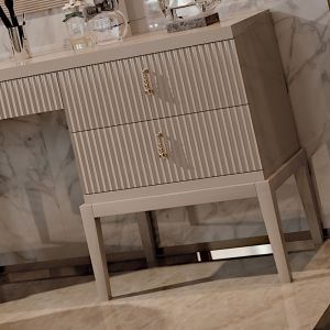 A high gloss cappuccino lacquered structure and base with feature deco style ribbed drawers and statement metal droplet handles in an antiqued gold finish.